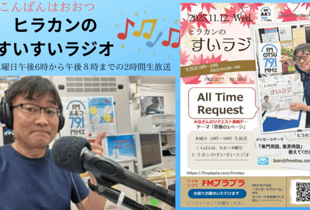 11月12日(水) #FMおおつ 79.1MHz 水曜日の18時〜20時は「こんばんは、おおつ」“ヒラカンのすいすいラジオ”でお楽しみください。 今回はヒラカン1人喋りの『すいラジオールタイムリクエス […] -