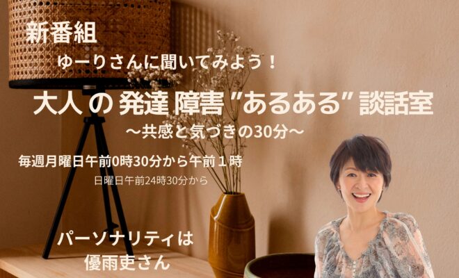 新番組 ゆーりさんに聞いてみよう!「大人の発達障害 あるある談話室」10月12日(日曜日)午前24時30分からの30分間