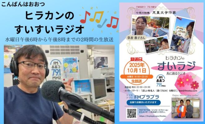 10月1日(水) #FMおおつ 79.1MHz 水曜日の18時〜20時は「こんばんは、おおつ」“ヒラカンのすいすいラジオ”でお楽しみください。