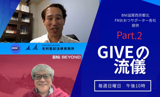 「GIVEの流儀 Part2」第16回 ゲストは「毛利聖紀法律事務所 毛利聖紀さん」です。BNI滋賀西京都北 提供