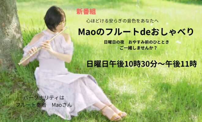 新番組 「Maoのフルートdeおしゃべり」〜心ほどける安らぎの音色をあなたへ〜 日曜日午後10時30分〜午後11時