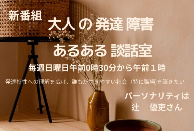 新番組 ゆりさんの「大人の発達障害 あるある談話室」日曜日午前24時30分から25時 パーソナリティはゆりさんです。 番組では、発達障害をテーマにしながらも、日常の「あるある」を通じて共感や気づきを提 […]