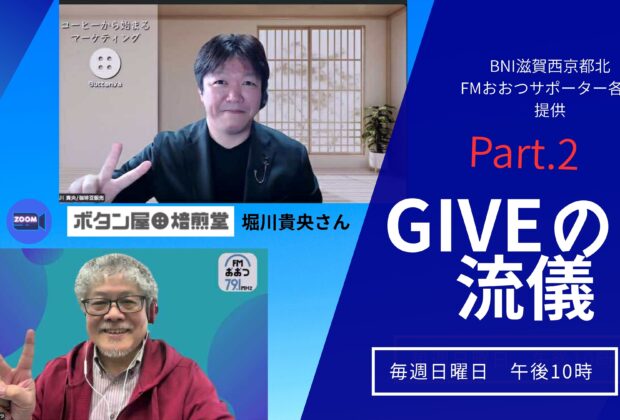 「GIVEの流儀 Part2」第15回 ゲストは「ボタンや焙煎堂の堀川貴央さん」です。BNI滋賀西京都北 提供