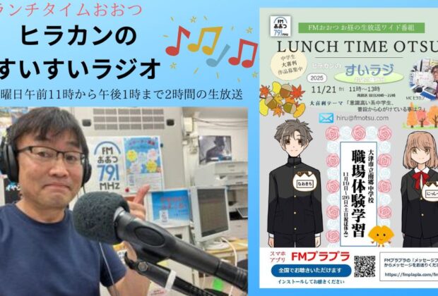11月21日(金) #FMおおつ 79.1MHz 11時〜13時は「ランチタイムおおつ」“ヒラカンのすいラジお昼の臨時号”でお楽しみください。 今回は中学生の「職場体験学習」のお2人と一緒です。 メッ […] -